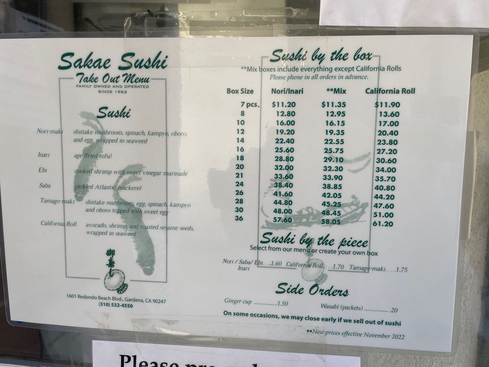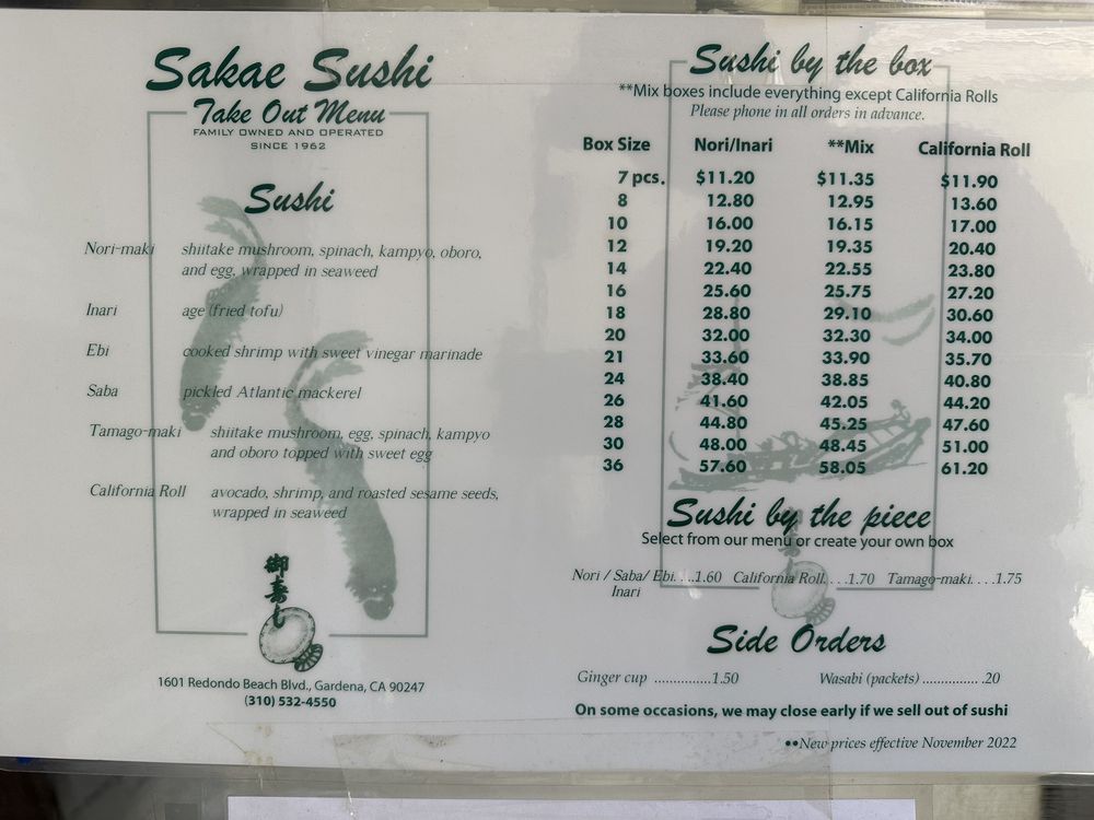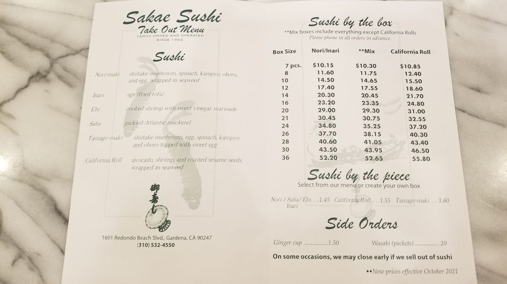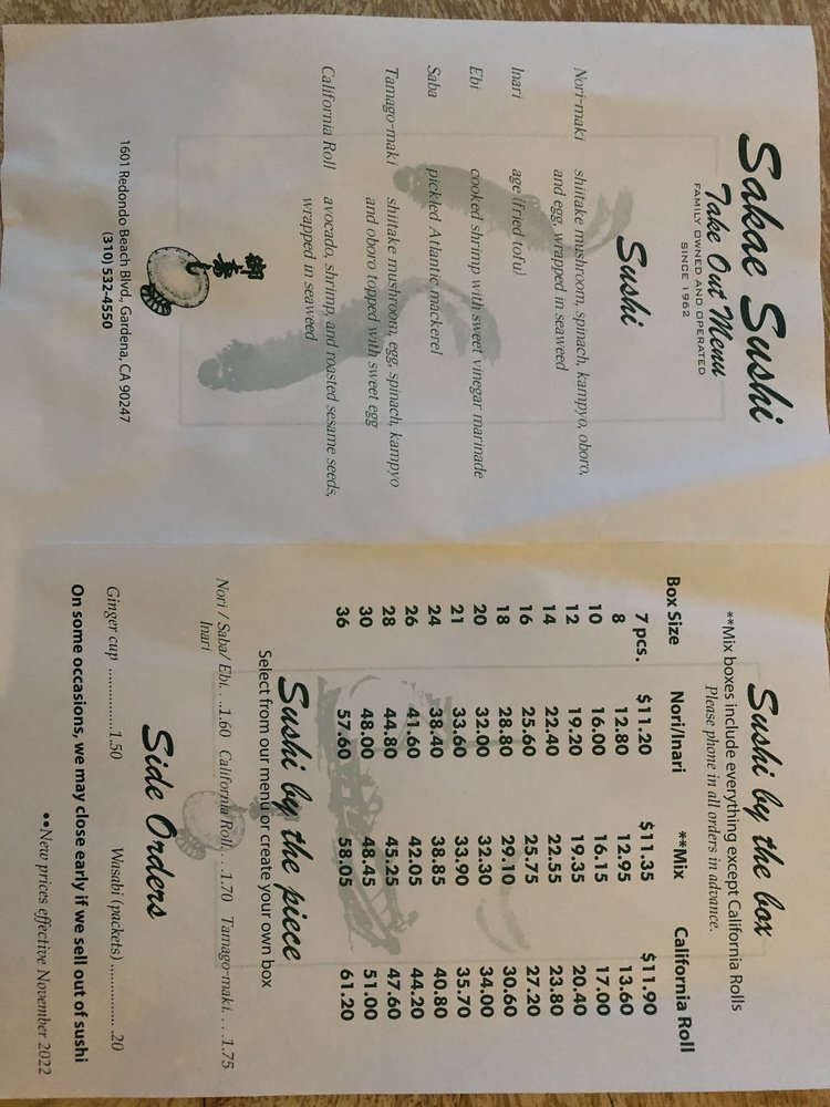 Introducing the menu at Sakae Sushi, a hidden gem in Gardena, CA, known for its simple yet delicious sushi offerings. This family-owned takeout spot has been around since the 1960s and prides itself on traditional, old-fashioned sushi preparation. The menu may be small, but every bite is packed with flavor and made with care. Highlights include the fresh California roll, customizable sushi boxes, and the mackerel that fans rave about. While the wait times can be long due to popularity, the quality and taste of the dishes make it worth the wait. From the friendly service to the generous portions, Sakae Sushi is a must-try for sushi lovers looking for an authentic and satisfying dining experience.